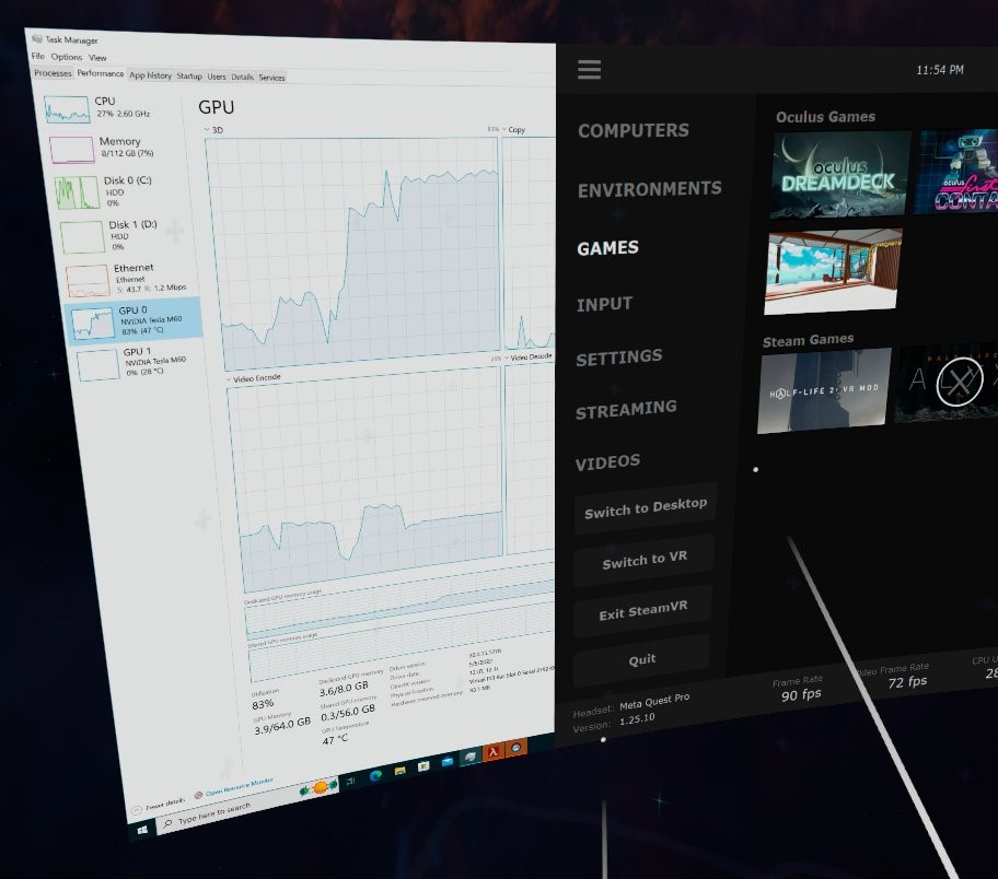 It depends. On the VR Desktop I set VR Graphics Quality on ‘Medium’ and VR Bitrate to Max ‘150Mbps’